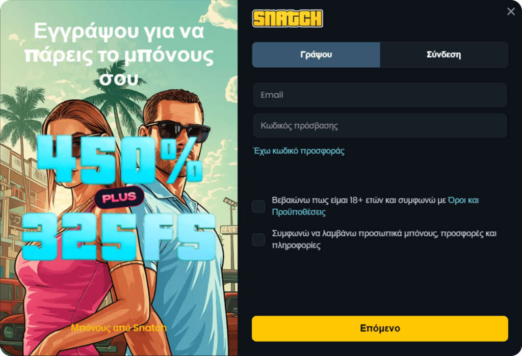 Στην παρούσα αξιολόγηση θα βρείτε όσα χρειάζεται να ξέρετε για το SnatchCasino πριν την εγγραφή: διαδικασία εγγραφής, μπόνους, παιχνίδια, επιλογές πληρωμής και άλλα.